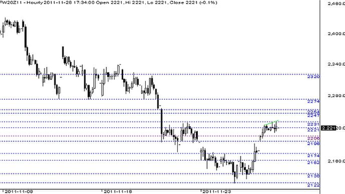 Wczorajsza sesja poprawiła humory bykom. Przedpołudniowe wzrosty zostały utrzymane praktycznie do końca sesji i kontrakt zakończył dzień wzrostem o 1,9%. W ciągu dnia kontrakt trzykrotnie testował opór na poziomie 2231, ale bez powodzenia. Impet kupujących był zbyt mały, by przebić się przez ten istotny poziom.