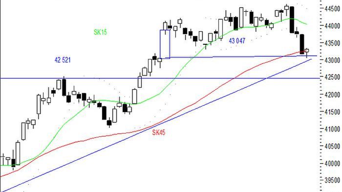 trakcie dzisiejszej sesji najbliższym wsparciem pozostaje poziom 43 047 pkt, natomiast od góry ruch ograniczać będzie połowa czarnego korpusu z wtorku.