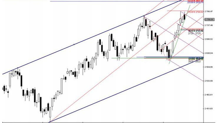 Wracając do analizy kontraktów warto nadmienić, że na wykresie 60 minutowym nastąpiło wczoraj przełamanie dość wiarygodnej linii kanału trendowego. Wspomniana linia zaczęła pełnić następnie rolę bariery podażowej (szczegóły w pierwszym komentarzu online). Nie jest to oczywiście jakiś wyjątkowo silny sygnał techniczny, tym bardziej, że na wykresie intradayowym możemy obecnie dostrzec formację trójkąta symetrycznego (co generalnie ma pozytywny wydźwięk). Krótkoterminowy układ techniczny wykresu pogorszyłby się jednak, jeśli w najbliższym czasie doszłoby do zanegowania zapory popytowej: 2741 – 2745 pkt. Kluczowa strefa wsparcia plasuje się z kolei w rejonie: 2720 – 2725 pkt. Jest to w moim odczuciu niezwykle interesujący zakres cenowy (głównym filarem konstrukcyjnym jest tutaj zniesienie 38.2%), gdzie jak widać na załączonym wykresie przecinają się także dwie (wygenerowane na bazie różnych punktów zaczepienia) median lines.