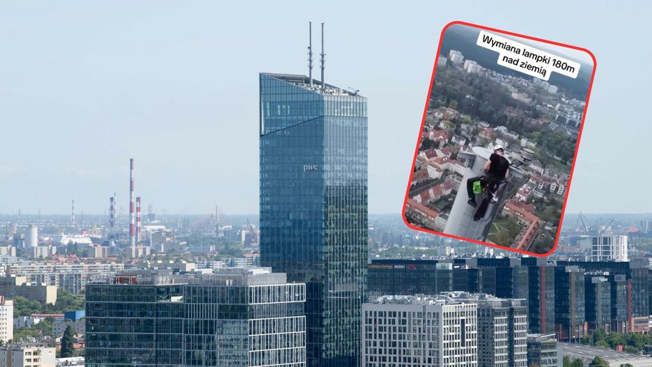 "Tak serio to oczywiście nie wymiana lampki, tylko przegląd techniczny na masztach Olivia Star. Btw – wejście na 34 piętro Olivia Star, gdzie sufit jest 7 m nad podłogą i nie ma słupów ani podpór w środku, robi takie samo piorunujące wrażenie" - napisał w mediach społecznościowych Kotarski.