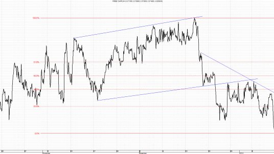 Kurs CHF/PLN od połowy października poruszał się w trendzie wzrostowym. Tuż przed świętami, ku radości kredytobiorców frankowych, w wyniku gwałtownych osłabień franka doszło do wybicia dołem z formacji. Następnie poruszał się dwa tygodnie w trendzie bocznym, po czym znowu gwałtownie osłabił się o kolejne 2 grosze. Najbliższym oporem dla dalszych wzrostów jest linia łącząca maksima lokalne grudnia i stycznia, czyli poziom 3,3800. Dla ruchu w dół następnym wsparciem są testowane obecnie okolice 3,3600, gdzie zakończył się obecny ruch.
