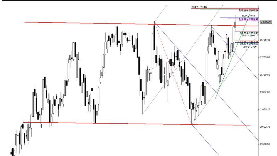 Tak czy inaczej konsekwencją piątkowego, niezwykle spektakularnego wybicia był wczoraj kolejny atak popytu, który „zaprowadził” kontrakty w okolice ważnej zapory podażowej: 2825 – 2828 pkt (zbudowanej na bazie zniesienia 113%).