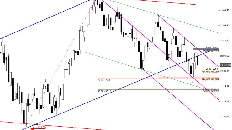 Zapowiedzią powrotu kontraktów na ścieżkę ich macierzystego (w ujęciu krótkoterminowym) trendu rynkowego uznałbym w obecnej sytuacji przełamanie wsparcia Fibonacciego: 2206 – 2210 pkt. wraz z przebiegającą nieco wyżej median line. Z załączonego wykresu wynika, że dodatkowym elementem wzmacniającym w/w zakres jest także dolna (zielona) linia kanału trendowego.