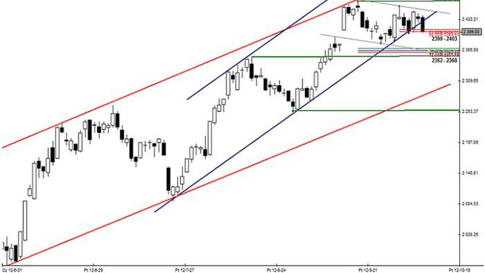 Trzeba przyznać, że poranne nastroje nie są zbyt korzystne dla byków (spadki w Azji, tracący na wartości eurodolar, zniżkujące – choć w niewielkim stopniu – kontrakty na US Futures). Również wczorajsza sesja za oceanem nie ułożyła się korzystnie dla popytu. Już w porannej fazie dzisiejszego handlu dojdzie zatem do zanegowania tak pieczołowicie bronionej ostatnio zapory cenowej: 2399 – 2403 pkt.