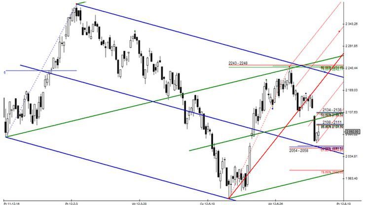 Istotnym wydarzeniem ostatnich sesji było z pewnością dotarcie kontraktów w okolice kluczowej zapory popytowej: 2054 – 2058 pkt. skonstruowanej na bazie zniesienia wewnętrznego 61.8%. Co prawda nie doszło do bezpośredniej konfrontacji we wskazanym przedziale cenowym, ale to właśnie z wymienionego rejonu bykom udało się zainicjować stosunkowo silny ruch odreagowujący (sesja wtorkowa).