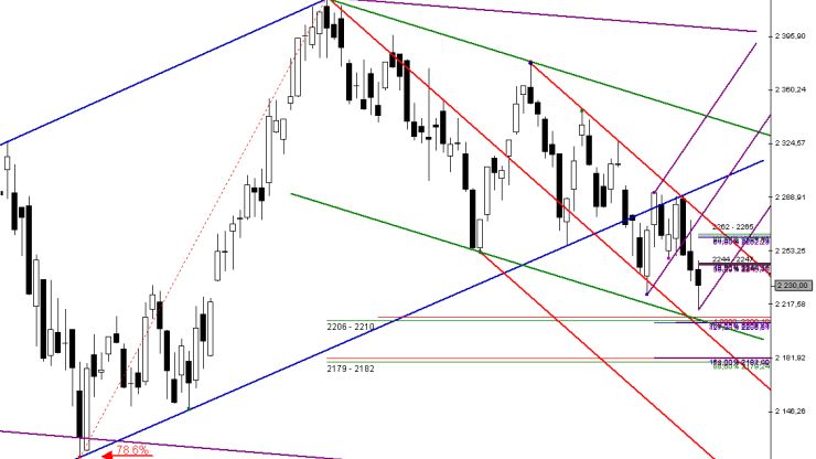 Faktem pozostaje zatem to, że kontrakty znalazły się w piątek w rejonie kolejnej zapory popytowej Fibonacciego. Ponieważ przebiega tutaj także dolna linia kanału trendowego (a nieco niżej median line), analizowany zakres plasuje się bardzo wysoko w hierarchii ważności. W przypadku kontynuacji ruchu spadkowego i przełamania tej strefy, niejako automatycznie zostałby wygenerowany silny sygnał techniczny zapowiadający niekorzystny dla posiadaczy długich pozycji wariant rozwoju wydarzeń (zwróciłbym wówczas uwagę na kolejny węzeł popytowy: 2179 – 2182 pkt. zbudowany na bazie zniesienia 78.6%). W moim odczuciu popyt powinien jednak uaktywnić się w rejonie: 2206 – 2210 pkt. Ponieważ wspomniana już median line przebiega obecnie poniżej wskazanej strefy, traktowałbym ją jako filtr cenowy dla wsparcia Fibonacciego.