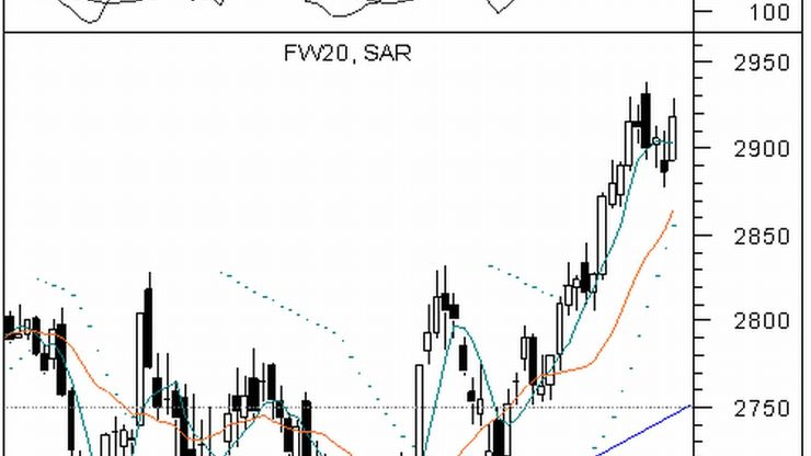 Sytuacja techniczna Środowa sesja nie rozczarowała posiadaczy długich pozycji. Seria kontynuacyjna kontraktów terminowych na WIG20 zakończyła dzień na 1,1% plusie. Obrazem graficznym notowań była biała świeca z dużym korpusem i górnym cieniem, umiejscowiona powyżej dwóch poprzednich. Maksimum intradayowe sięgnęło 2 929 pkt, zaledwie 9 pkt poniżej szczytu hossy na FW20. Bliskość szczytu sugeruje przewagę optymizmu na sesji i prawdopodobieństwo pozytywnej końcówki tygodnia.