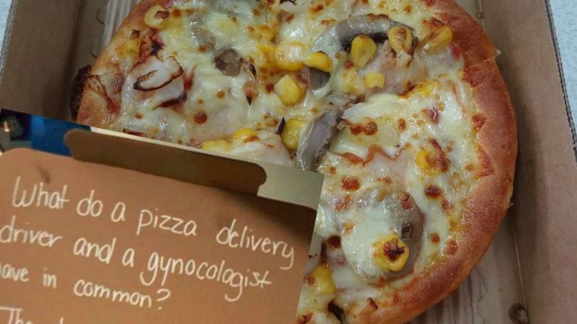 "Co łączy dostawcę pizzy i ginekologa? Obaj mogą powąchać, ale nie mogą posmakować." - tak można przetłumaczyć żart na język polski.