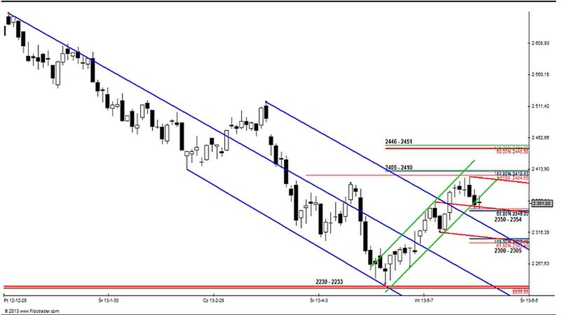 Z rejonu ważnej zapory podażowej: 2405 – 2410 pkt. rozwinął się jak wiadomo ruch korekcyjny, który dotarł we wtorek do eksponowanego przeze mnie wsparcia Fibonacciego: 2350 – 2354 pkt. Ponieważ strefa posiadała dodatkowo ważne wzmocnienie w postaci przebiegającej tutaj Median Line należało liczyć się z tym, że popyt nie dopuści tak łatwo do jej zanegowania (w przeciwnym bowiem razie zostałby wygenerowany stosunkowo silny, krótkoterminowy sygnał techniczny zapowiadający kolejny atak niedźwiedzi).
