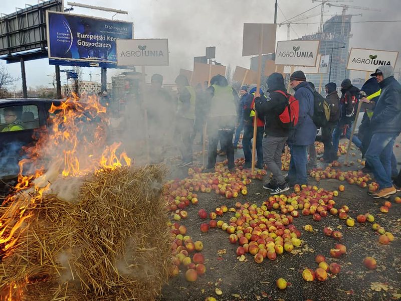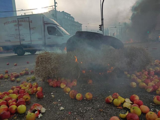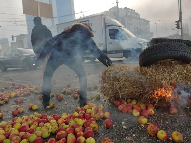 Rolnicy z AGROunii zablokowali plac Zawiszy w Warszawie. Na jezdni położyli świńskie łby, rozsypali jabłka i podpalili opony i słomę. "Te jabłka to dzieciom trzeba dać w przedszkolach, a nie wysypywać na placu i kierowcom przeszkadzać" - powiedział minister rolnictwa Jan Ardanowski.