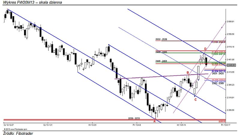 Warto w tym kontekście podkreślić, że otwarcie FW20M13 wypadło aż 14 punktów poniżej piątkowej ceny odniesienia. Tym samym można było odnieść wrażenie, że w rejonie średnioterminowej zapory podażowej Fibonacciego: 2488 – 2495 pkt. ukształtował się lokalny punkt zwrotny i kolejne fazy handlu mogą okazać się niesprzyjającym okresem dla posiadaczy długich pozycji.