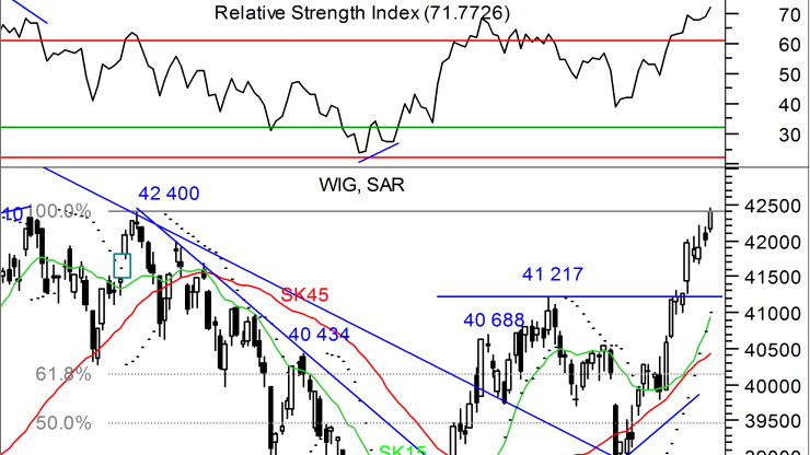 Poświąteczna sesja rozbudziła nadzieje inwestorów w Warszawie na pozytywną końcówkę tygodnia. Dynamiczny, poranny atak popytu wyniósł kurs indeksu szerokiego rynku w pobliże marcowych szczytów i co ważniejsze do końca sesji sprzedającym nie udało się przeprowadzić skutecznego kontrataku. 0,98% wzrost na zamknięciu pozwolił na wyrysowanie w układzie dziennym białej świecy z długim korpusem, świadczącej o przewadze kupujących w trakcie dnia. Notowania zatrzymały się na poziomie 42 408 pkt a więc 8 pkt powyżej oporu. Fakt ten skłania do poglądu, że popyt nie powiedział jeszcze ostatniego słowa a najbliższy opór na 42 439 pkt, ustanowiony przez szczyt z lutego stoi w zasięgu ręki już w trakcie dzisiejszej sesji. Prowzrostową tendencję potwierdziły wczoraj również obserwowane oscylatory. RSI pokonał swój szczyt z czerwca kierując się w stronę górnego ograniczenia zakresu wahań, charakterystycznego dla rynku wzrostowego, a zatem poziomów nieobserwowanych od lutego. Ruch potwierdza również z każdym dniem