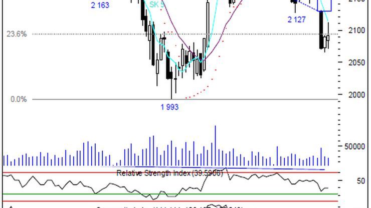 Wyrysowana na wykresie serii kontynuacyjnej biała szpulka wpisuje się w niemrawe nastroje rynkowe, co dodatkowo potwierdza niska aktywność na parkiecie. Byki kolejny raz z rzędy podjęły próbę ataku na opór w postaci połowy poniedziałkowego korpusu i drugi dzień z rzędu okolice 2 100 pkt, dodatkowo wzmocnione przez przebiegający w tych okolicach poziom zniesienia Fibonacciego, okazały się zbyt mocną barierą. Dopóki więc popyt nie pokona tych poziomów – a wiarygodny ruch potwierdzający zapał byków powinien doprowadzić do szybkiego zanegowania ostatniego, czarnego korpusu – psychologiczna przewaga należy do strony podażowej. Szybkie oscylatory kontynuują ruch w ślad za kursem rynkowym. Średnioterminowy ADX zdaje się konsekwentnie zmierzać do granicznego poziomu 20 pkt, co potencjalnie może zdynamizować rynkowe manewry.