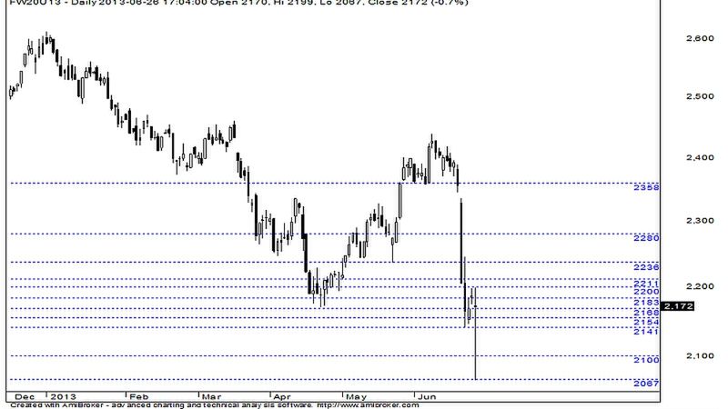 Potem nastąpił szybki wzrost powyżej poziomu 2100, a gdy w czasie konferencji rządowej na temat planów wobec OFE padły zapewnienia, że rząd nie zamierza likwidować OFE, kursy kontraktów wzrosły do poziomu 2199. Tak więc poziom oporu na 2200 nawet w takiej sytuacji okazał się nie do pokonania. Potem znów mieliśmy cofnięcie rynku, wahania w obu kierunkach i ostatecznie rozliczenie sesji po 2172.