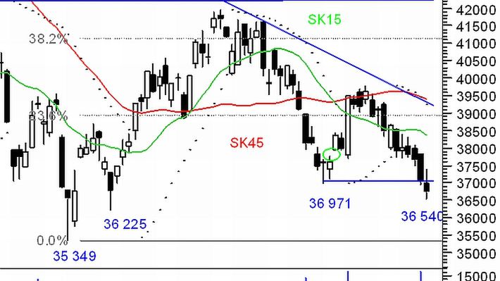 dzisiejszych notowań najbliższym wsparciem staje się poziom 36 225 pkt, ostatnio notowany początkiem października tego roku. Brak szybkiej reakcji ze strony kupujących może doprowadzić do testu długoterminowego dołka całej, półrocznej fali spadkowej.