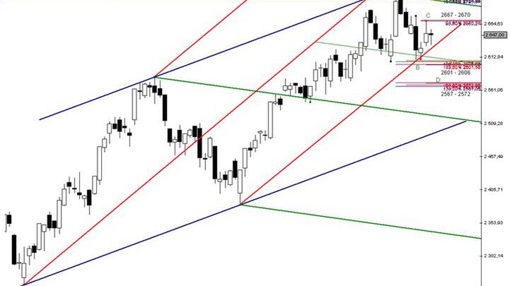 Wracając jeszcze do strefy: 2601 – 2606 pkt trzeba przypomnieć, że właśnie z wymienionego rejonu cenowego bykom udało się w minionym tygodniu zainicjować ruch odreagowujący, który wytracił swój impet w okolicy zniesienia 61.8% zaznaczonego na wykresie ruchu AB (strefa: 2667 – 2670 pkt). Wspominam o tym, gdyż istotnymi elementami potwierdzającymi w/w przedział Fibonacciego były dwie median lines (kolor czerwony i zielony).