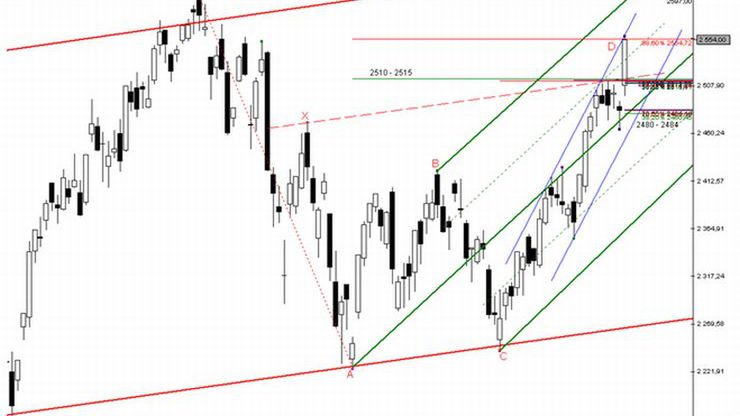 W wyniku wczorajszego ataku popytu naruszona została ważna strefa oporu Fibonacciego: 2536 – 2541 pkt. Jak wiadomo koncentrują się tutaj projekcje dość rozległej, potencjalnej formacji XABCD. Układ ma wymiar spadkowy, jednak zachowanie rynku nie potwierdza na razie słabości obozu popytowego. Wręcz przeciwnie. To byki nadają ton obecnym wydarzeniom i to one mają wyraźną przewagę na rynku (potwierdzają to również płytkie korekty spadkowe, które jak wiadomo – analizowałem tę kwestię w opracowaniach online – przybierają dodatkowo postać klasycznych formacji ABCD).