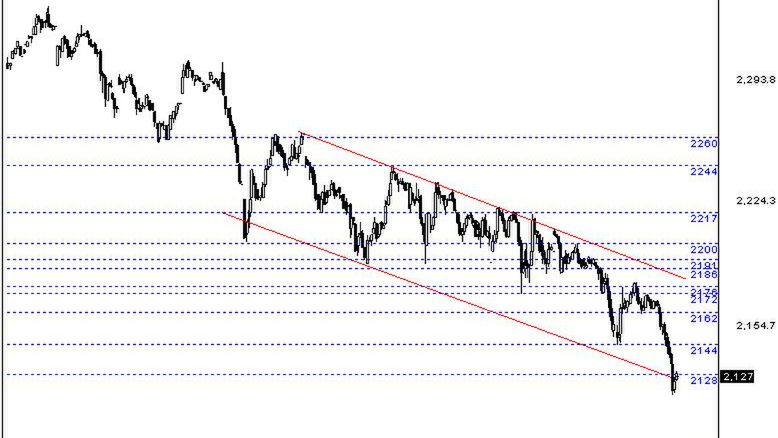 Wczorajsza sesja rozpoczęła się od spadku o 11 punktów. Spadki zostały pogłębione i kontrakt niedługo po otwarciu zanotował przedpołudniowe minimum na poziomie 2144. Po otwarciu kasowego nastąpiło odreagowanie, które pozwoliło na wzrost do poziomu 2176.