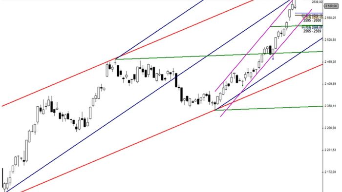 W swoich ostatnich opracowaniach eksponowałem jak widomo znaczenie zakresu: 2584 - 2593 pkt. i kolejnego węzła cenowego: 2634 - 2642 pkt. Odpowiednikiem tej ostatniej strefy na wykresie serii marcowej jest wyeksponowany dzisiaj przedział: 2638 - 2647 pkt. Jak widać wskazany zakres został już przetestowany. Z załączonego wykresu wynika, że przebiega tutaj także Median Line. Jest to zatem element wywodzący się z klasycznej analizy technicznej, który wzmacnia znaczenie w/w przedziału. Od kilku dni obóz byków ma problem z zanegowaniem tej przeszkody.