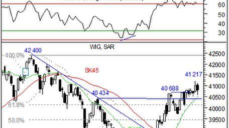 W piątek chęć realizacji zysków zwyciężyła a podaż odebrała popytowi cześć z mozołem zdobytych dzień wcześniej punktów. Indeks szerokiego rynku zamknął dzień spadkiem o 0,54% przy obrotach na poziomie 591,8 mln zł. Efektem graficznym kończących tydzień zmagań była czarna świeca, podkreślająca przewagę sprzedających. Przecena w trakcie dnia nie naruszyła wsparcia na 40 434 pkt a w cenach zamknięcia spadki zatrzymały się w okolicy otwarcia z czwartku, tym samym nie negując istotnego wsparcia w postaci 40 688 pkt. Fakt ten sprawia, że obrona wspomnianego poziomu może przynieść chęć odreagowania w trakcie dzisiejszej sesji. Szanse wzmacnia stosunkowo niewielki obrót wskazujący, że piątkowe notowania były raczej wynikiem bierności popytu, niż faktycznego ataku podaży. W obrazie wskaźnikowym sesja uzyskała neutralny obraz. RSI nadal przebywa w konsolidacji podobnie jak Composite Indeks. W trakcie dzisiejszych notowań spodziewać się można zatem ponownego ataku na szczyt z czwartku. Nieudana próba implikować będzie