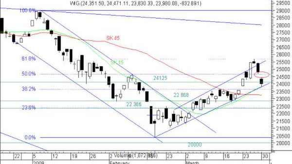 Do niedawna na rynek nadchodziły informacje, iż w 2009 roku poprawiła się sytuacja ekonomiczna największych grup finansowych, m.in. Citigroup, Bank of America. To generowało sporo nadziei wśród inwestorów. W piątek prezes JP Morgan powiedział, że mijający miesiąc był ciężki dla jego spółki. W poniedziałek zaczęły się pojawiać kolejne pesymistyczne wiadomości dotyczące sektora bankowego, a także samochodowego. Rząd USA przekazał, iż widzi duże prawdopodobieństwo konieczności dalszej pomocy dla amerykańskich banków. Zwolniony został prezes General Motors, a plany restrukturyzacyjne GM oraz Chryslera zostały skrytykowane przez administrację Baracka Obamy i ponownie pojawiły się spekulacje, że te firmy zbankrutują. Kumulacja złych wiadomości musiała się odbić na giełdach. Te azjatyckie rozpoczęły nowy tydzień od nawet ponad czteroprocentowych minusów (Nikkei -4,5%, Hang Seng -4,7%). Tam strona podażowa dodatkowo wspierana była danymi o kolejnym dużym spadku produkcji przemysłowej w Japonii. Indeksy Starego