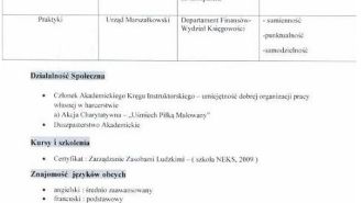 Opis zadań, podobnie jak data, został zupełnie pominięty przy praktykach. Czym zajmowała się tam Alicja? W jaki sposób nauczyła się samodzielności i sumienności pozostaje tajemnicą. W części poświęconej umiejętnościom „miękkie” sąsiadują z „twardymi”. Lepiej skupić się tutaj na tych drugich (jak obsługa komputera – może biegle korzystasz z konkretnych programów?) lub popartych certyfikatami. Proponujemy, żeby w to miejsce przenieść: zarządzanie zasobami ludzkimi (certyfikat szkoły NEKS, 2009), który samodzielnie w rubryce kursy i szkolenia wygląda nazbyt ubogo.
