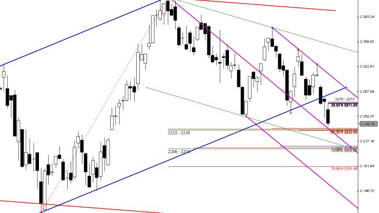 Z załączonego wykresu wynika, że kontrakty dotarły wczoraj do istotnego wsparcia Fibonacciego zbudowanego na bazie zniesienia 61.8%. Ważnym wzmocnieniem strefy jest także przebiegająca w tym rejonie median line. Biorąc pod uwagę spadkowy charakter wczorajszej sesji za oceanem istnieje duże prawdopodobieństwo, iż analizowany zakres: 2232 – 2235 pkt. zostanie w porannej fazie handlu naruszony.