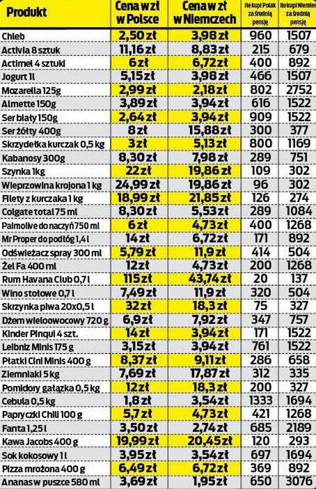 Niemiec może miesięcznie np. kupić 1,5 tysiąca bochenków chleba, Polak niecały tysiąc. W przypadku produktów bardziej ekskluzywnych, jak ananas w puszce, różnica jest jeszcze większa. Niemiec dostanie za pensję ponad 3 tysiące takich puszek, Polak zaledwie 650. Ale co najgorsze, porównując bezpośrednio ceny na sklepowych półkach, Niemiec kupi taniej większość towarów.