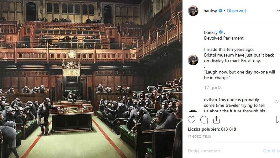 Streetartowy artysta przypomniał na Instagramie swój obraz sprzed 10 lat. Dzieło "Devolved Parliament" ("Zdegenerowany parlament") znowu zostało wystawione w muzeum sztuki w Bristolu na południu Anglii.