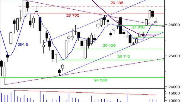 Powstała na wczorajszej sesji świeca o niewielkim korpusie i długim górnym cieniu sygnalizuje istniejącą podaż, ograniczającą działania popytu. Spadek został powstrzymany tuż nad górnym ograniczeniem trójkąta oraz obszernej luki hossy z 5 I stanowiącej obszar wzmożonej aktywności kupujących, którzy chcąc przypuścić w niedługim czasie atak na strefę oporu 29 600 – 29 641 pkt. nie powinni dopuścić do znacznego przełamania dolnego ograniczenia kanału wzrostowego a utrzymanie go nie jest takie pewne. Obawy nasuwa MACD, którego wartość wzrosła ponad linię równowagi, generując co prawda sygnał kupna, to jednak warto zwrócić uwagę, na jego powstrzymywanie w tym rejonie na przestrzeni ostatniego roku. Martwić może również bardzo szybki powrót indeksu poniżej górnego ograniczenia luki bessy z 12.11 oraz wygenerowane sygnały sprzedaży na szybkich oscylatorach, zmuszających do bacznego obserwowania wymienionych wsparć.