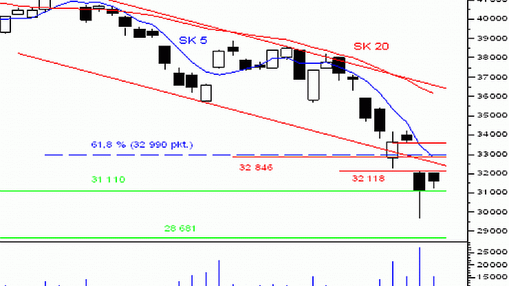 Wczorajsza sesja zawiodła inwestorów pod względem skali wzrostów i nie wprowadziła wielkich zmian do obrazu AT. Po niespotykanie dużym spadku w piątek pokładane nadzieje w indeksie były o wiele większe niż zaserwowane. Indeks odnotował jedynie symboliczny wzrost, tworząc świecę podobną do piątkowej, zbliżonej kształtem do młota, usytuowanego tuż pod pierwszym oporem w postaci piątkowego maksimum. Wobec problemów z przełamaniem tego poziomu, siła popytu jest poddawana tym bardziej w wątpliwość. Powodu do optymizmu nie dają wskazania średnioterminowych wskaźników, szczególnie MACD oraz ADX, wciąż wskazujących na przewagę podaży. Sygnały na tych indykatorach pojawiają się jednak z dużym opóźnieniem a biorąc pod uwagę wysokie wyprzedania rynku, można w dwóch ostatnich świecach doszukiwać się prób powstrzymania sprzedających. Zakładając, że otwarcie na indeksie nastąpiłoby powyżej 32 118 pkt. i w razie ewentualnego cofnięcia do tego poziomu indeks utrzymałby go powracając do wzrostów, mógłby to być pierwszy