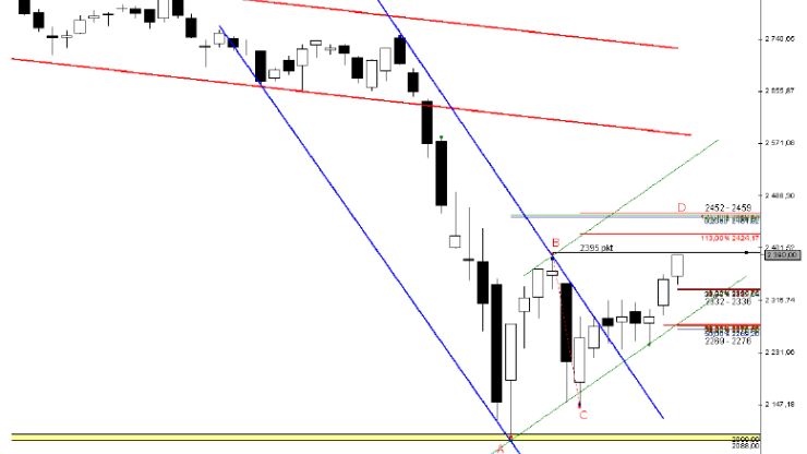 W obecnej sytuacji następstwem zanegowania w/w zniesienia powinien być test zapory podażowej: 2452 – 2459 pkt. Układ techniczny wykresu pogorszyłby się jednak, gdyby doszło do konfrontacji w rejonie zniesienia 113%, po czym kontrakty ponownie przedostałyby się poniżej 2395 pkt (sierpniowy szczyt). Nie wykluczam, że w przypadku urzeczywistnienia się tego typu sekwencji zdarzeń kolejny ruch również należałby wówczas do sprzedających.