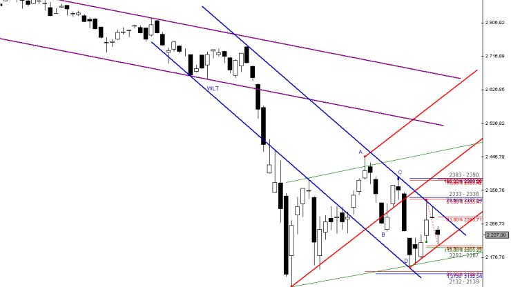 Warto zatem podkreślić, że istotną rolę odegrała wczoraj strefa wsparcia Fibonacciego: 2203 – 2207 pkt. wraz z przebiegającą tutaj median line. Bykom ostatecznie udało się wybronić ten stosunkowo istotny przedział cenowy, ale trudno jednak ten fen fakt zestawiać z dominującym przez całą sesję obozem podażowym. Niedźwiedzie miały bowiem wczoraj zdecydowaną przewagę, choć zabrakło tej przysłowiowej kropki nad „i” w postaci przełamania 2203 – 2207 pkt.