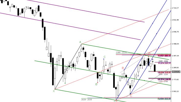 W efekcie, co widać na przedstawionym wykresie, kontrakty przetestowały kolejny obszar wsparcia Fibonacciego: 2230 – 2235 pkt. Czytelnicy moich komentarzy online wiedzą, że w wymienionym rejonie koncentrują się również projekcje symetrycznej, prowzrostowej formacji ABCD. Tym samym mamy tutaj do czynienia z dość newralgicznym zakresem cenowym, gdzie teoretycznie obóz byków powinien w aktywny sposób podejmować działania obronne. To co jednak może niepokoić, to stopniowe oddalanie się kontraktów od ważnego węzła Fibonacciego: 2366 – 2374 pkt. Wzrost aktywności podaży we wspomnianym rejonie cenowym świadczy zatem o nieprzypadkowym umiejscowieniu tej strefy. Na wykresie, o czym już wspominałem w swoich poprzednich opracowaniach, możemy także dostrzec ogromne podobieństwo widocznego na wykresie impulsu ABCD (czerwone oznaczenie) z ruchem cenowym zaznaczonym szarą, pogrubioną linią.