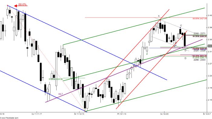 Z załączonego wykresu wynika, że kontrakty opuściły wczoraj korytarz cenowy wytyczony przez czerwone linie kanału trendowego. Silny impuls podażowy wytracił jednak swój impet w przedziale wsparcia Fibonacciego: 2325 – 2329 pkt. Jak już podkreślałem w swoich wcześniejszych opracowaniach, we wskazanym rejonie koncentrują się między innymi projekcje prowzrostowej formacji ABCD.