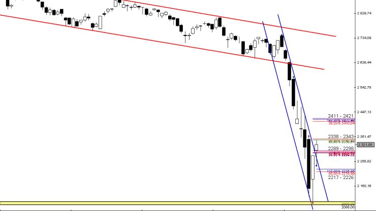Na skrajnie wyprzedanym rynku nie może oczywiście dziwić to, że na rynku doszło do lokalnego zwrotu cenowego. Pozytywnie należy jednak interpretować kwestię pojawienia się popytu w rejonie znanej nam już zapory cenowej Fibonacciego: 2088 – 2098 pkt. To bowiem świadczy o tym, że nawet na skrajnie rozhisteryzowanym i nacechowanym naprawdę ogromnymi emocjami rynku popyt podjął działania obronne tam, gdzie generalnie należało się tego spodziewać.