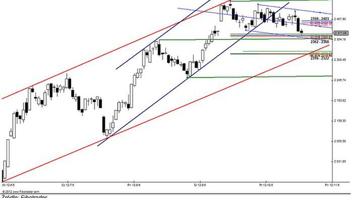 W końcówce piątkowej sesji niedźwiedziom udało się jak wiadomo uzyskać znaczącą przewagę. Można stwierdzić, że dość wyraźnie odczuwalne zawahanie popytu na poprzednich sesjach świadczyło jednak o powolnym wyczerpywaniu się potencjału wzrostowego rynku. Kulminacyjnym momentem okazało się piątkowe uderzenie podaży, w wyniku którego kontrakty znalazły się w okolicy kluczowego przedziału wsparcia: 2362 – 2368 pkt.