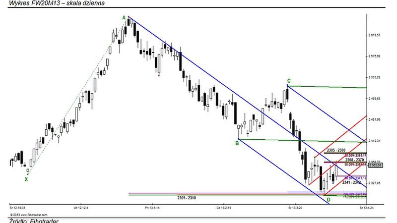 Skoro jednak mowa o zaporach podażowych to musimy pamiętać, że dużo istotniejszy w stosunku do w/w strefy pozostaje obecnie opór Fibonacciego: 2385 - 2388 pkt. To właśnie w tym korytarzu cenowym wypadają między innymi projekcje pro-spadkowej, symetrycznej formacji XABCD.Tak jak sugerowałem w swoich ostatnich opracowaniach, dopiero w momencie zanegowania tej charakterystycznej struktury moglibyśmy przyjąć wstępne założenie, że na FW20M13 dochodzi do zmiany trendu ze spadkowego na wzrostowy.