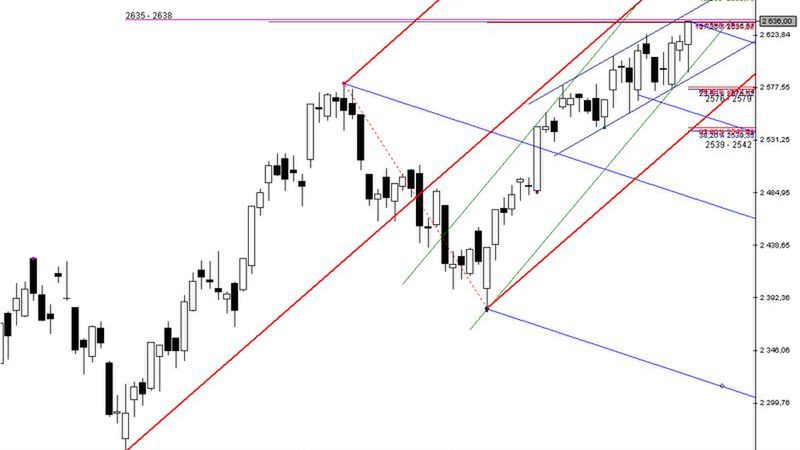 W kontekście pierwszej „wytycznej” trzeba przyznać, że na wykresie intradayowym można w tej chwili „odnaleźć” wzór przypominający układ XABCD (choć nie jest to na pewno formacja „książkowa”). Kilka punktów ponad zakresem: 2635 – 2638 pkt wypada między innymi projekcja AB = CD. Jest to zatem stosunkowo istotna obserwacja, choć wymaga na pewno jeszcze uzyskania dodatkowego potwierdzenia (nieco szerzej poruszę tę kwestię w opracowaniach online).