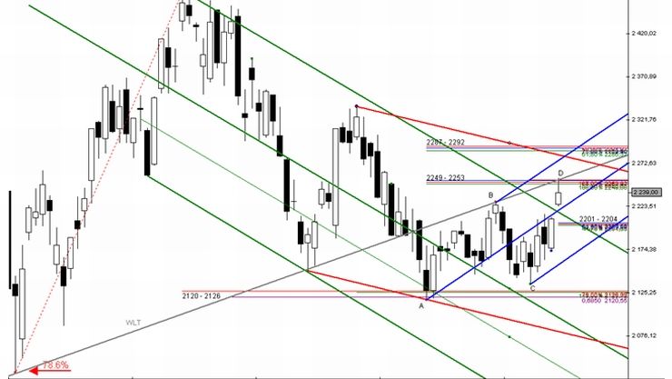 Koniec końców kontrakty dotarły do kolejnego węzła podażowego: 2249 – 2253 pkt. W komentarzu porannym podkreślałem znaczenie w/w obszaru cenowego wskazując jednocześnie, że między innymi koncentrują się tutaj projekcje symetrycznej formacji ABCD. Na fali silnego uderzenia popytu na rynku kasowym strefa: 2249 – 2253 pkt. została w niewielkim stopniu naruszona (maksimum wypadło na poziomie 2256 pkt.). Co istotne jednak obóz byków zaczął stopniowo tracić pewność siebie właśnie w rejonie: 2249 – 2253 pkt., choć ta okoliczność nie przekładała się na jakiś wyraźny wzrost presji podażowej. Przez kilka następnych godzin na rynku nie mogło zatem dojść do uformowania się ruchu korekcyjnego (gdy Citigroup podał jednak gorsze od oczekiwań wyniki kwartalne nastroje popsuły się na tyle mocno, że niedźwiedziom udało się wreszcie zaakcentować swoją obecność).