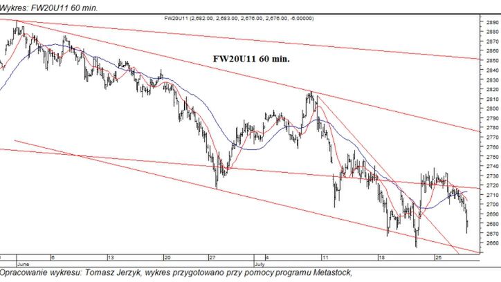 Kontrakt odnotował spadek do 2676, a strona podażowa przeważała prawie przez całą sesji. Dynamika spadku uległa przyspieszeniu w samej końcówce sesji, kiedy to kontrakt przełamał wsparcia na 2699 i 2684.