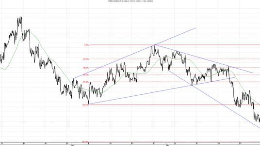 Kurs EUR/PLN utworzył kanał spadkowy. W przypadku ruchu powrotnego w górę, ograniczenie formacji znajduje się obecnie w okolicach 4,1850. Kolejny opór znajduje się na 4,2150, czyli maksimum ostatniego ruchu. Kurs przebił w zeszłym tygodniu ważne minima ostatnich miesięcy na 4,1500. Najbliższym wsparciem jest poziom 4,1300.