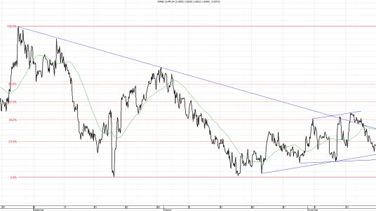 Kurs GBP/PLN utworzył stromy trend wzrostowy, jednakże po odrobieniu spadków z października przeszedł w trend boczny. Najbliższym oporem jest poziom 5,0000, czyli linia łącząc ostatnie maksima kursowe. Dla ruchu w dół następnym wsparciem są okolice 4,9700, czyli poziom, od którego odbił się obecny ruch.