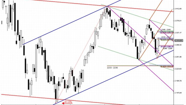 Wczorajsze zanegowanie lokalnej zapory podażowej: 2299 – 2303 pkt. (między innymi wypadało tutaj zniesienie 38.2% całej poprzedniej fali spadkowej) było według mnie dość istotnym wydarzeniem technicznym (oczywiście w ujęciu krótkoterminowym). Obóz byków wykazał się zdecydowanie większą aktywnością, choć na razie trudno jeszcze przewidzieć, czy mamy do czynienia z trwałą zmianą sentymentu rynkowego. Wydaje się, że takim dodatkowym potwierdzeniem byłoby sforsowanie zakresu: 2340 – 2343 pkt. wraz z przecinającymi się nieco wyżej median lines. Jest to w moim odczuciu ważny obszar cenowy na wykresie FW20M12, którego sforsowanie wygenerowałoby kolejny, niezwykle istotny sygnał techniczny.