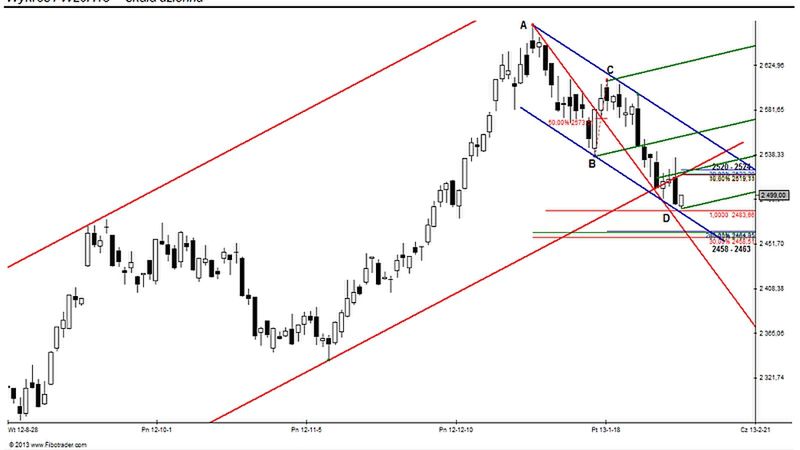 poniedziałkowe uderzenie podaży nie bardzo jednak wpisywało się w przedstawioną sekwencję zdarzeń. Niedźwiedzie zaatakowały na tyle skutecznie, że pod ich naporem rozleciało się eksponowane wcześniej wsparcie: 2499 – 2503 pkt. Warto przypomnieć, że kontrakty znalazły się w okolicy poziomu cenowego 2483 pkt. wytyczonego na bazie zależności AB = CD. Indeks WIG20 tymczasem dotarł do kluczowej bariery popytowej Fibonacciego: 2470 – 2480 pkt., gdzie również głównym elementem konstrukcyjnym strefy były projekcje symetrycznego układu ABCD.