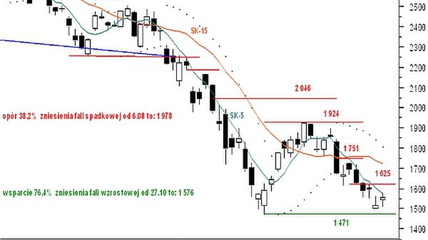 Na piątkowej sesji na wykresie kontraktów terminowych pojawiła się świeca szpulka z widocznie dłuższym dolnym cieniem. Strona kupująca po raz kolejny wybroniła okolice październikowego dołka, co oznacza, że szansa na odbicie wzrosła znacząco. Pierwszym oporem, którego przełamanie będzie potwierdzać umacnianie się popytu wydaje się poziom 1 625 pkt, wyznaczający górny zakres wahań z ostatnich 4 sesji. Kupującym będzie także pomagał Stochastic, który przeciął swoją średnią i jest już o krok od wygenerowania sygnału kupna. Zarówno MACD jak i ADX nie zmieniły istotnie swojego położenia, co nadal jest argumentem podaży, ale nie wyklucza jednocześnie próby odreagowania. Gdyby próbować wstępnie rozpoznać obecną sytuację jako potencjalnie formację podwójnego dna, to warunkiem koniecznym potwierdzającym taką formację jest przełamanie maksimów zlokalizowanych na 1 924 pkt, co z kolei oznaczałoby ruch do 2 350 pkt. Jest to na razie hipotetyczny tylko scenariusz, gdyż aktualnie trudno doszukiwać się trwalszego