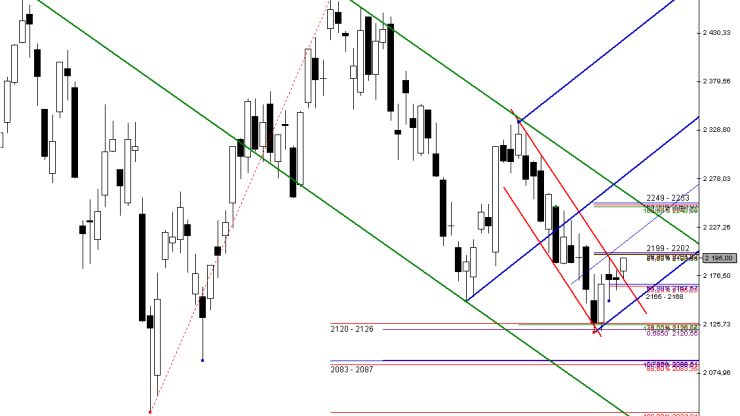 Pamiętając o powyższym zastrzeżeniu warto jednak podkreślić, że trwałe zanegowanie zapory podażowej: 2199 – 2202 pkt. powinno okazać się stosunkowo ważnym wydarzeniem technicznym zapowiadającym kontynuację ruchu wzrostowego i test kolejnej bariery cenowej: 2249 – 2253 pkt. (zbudowanej już na bazie zniesienia 38.2%). W takim przypadku uzyskalibyśmy również potwierdzenie, że wtorkowy atak nie był jedynie spontaniczną reakcją popytu na skrajnie wyprzedanym rynku, lecz stanowił odzwierciedlenie pewnych istotnych zmian strukturalnych jakie zaszły w bieżących relacjach panujących pomiędzy popytem i podażą.