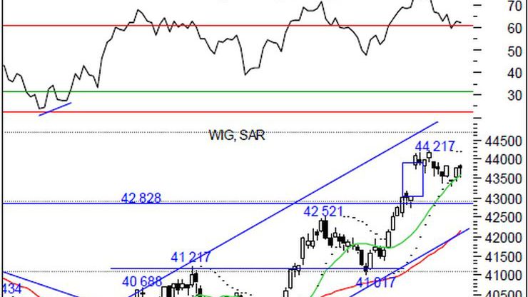 Piątkowa sesja przyniosła spadek indeksu szerokiego rynku o 0,05% przy obrotach 929 mln zł. Znikomy ruch indeksu wpisał się w całotygodniowy obraz rynku, który kreślił konsolidację. Obrazem graficznym notowań stała się niewielka czarna świeca z dłuższym, dolnym cieniem, umiejscowiona nieznacznie powyżej poprzedniej. Zakończenie notowań w okolicach odniesienia świadczy o utrzymujących się nadziejach popytu na kontynuację zapoczątkowanego dwa dni wcześniej odbicia. W najbliższym czasie te stronę rynku wspierać będzie również obroniona w piątek SK15, ale z drugiej strony wciąż niepokonana pozostaje górna granica luki sprzed dwóch tygodni. Niejednoznaczność sytuacji podkreślają również obserwowane szybkie oscylatory. RSI nadal utrzymuje się na granicy linii wsparcia na 60 pkt, co wspiera popyt, choć bez większego entuzjazmu ze strony filtrujących go Composite Index i Derivative Oscillator. Dość płasko zachowuje się również ADX, który po osiągnięciu ostatniego szczytu wyhamował wzrosty i przeszedł w ruch boczny.