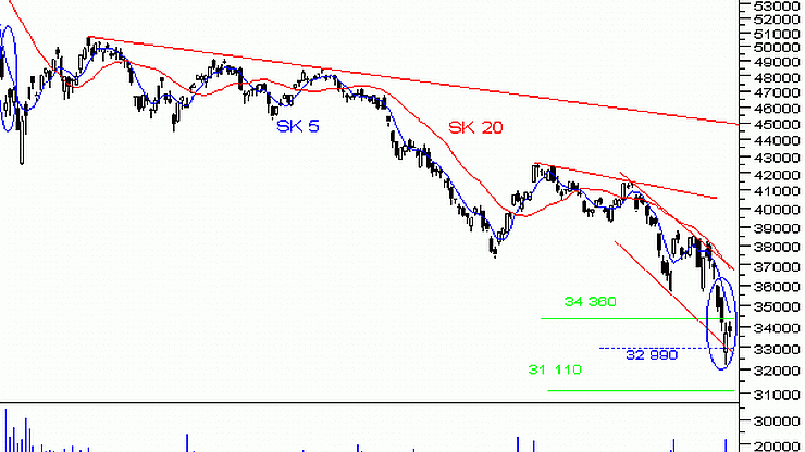 Wczorajsza sesja poprawiła notowania, lecz jedynie o niewielki wzrost, pierwszy od 6 sesji. Niestety wielkość tego wzrostu nie była na tyle duża na ile można się było tego spodziewać, co stawia stronę popytową jednak w dużo trudniejszym położeniu. Niepewność inwestorów, co do wzrostu została zobrazowana przez utworzenie niewielkiej szpulki, usytuowanej, tuż pod górną granicą strefy wsparcia 34 360 pkt. W obecnej sytuacji stwierdzenie, im większy spadek, tym większa korekta, można zaliczyć do „czarnego humoru”, zwłaszcza kiedy średnioterminowe wskaźniki nie reagują niewielkie odbicia. Obecna sytuacja WIGu przypomina układ świec z końca stycznia tego roku, gdzie po długofalowym spadku, nastąpiła niewielka korekta, przy wysokim wolumenie obrotów (tak jak na ostatnich sesjach) a po niej ogromnych rozmiarów spadek, wyznaczający dołek. Biorąc pod uwagę fakt, iż historia lubi się powtarzać oraz przebywanie indeksu wciąż powyżej dolnego ograniczenia strefy wsparcia 31 110 pkt. daje nadzieje na wyznaczenie dołka