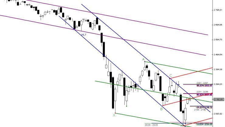 Przypominam te wydarzenia, gdyż w przedpołudniowej fazie wczorajszego handlu nadal mieliśmy do czynienia z taką właśnie sytuacją. Strona popytowa zdołała co prawda zainicjować silny ruch cenowy, ale na skutek nagłego pogorszenia się atmosfery na wiodących rynkach Eurolandu kontrakty w szybkim tempie powróciły w okolice znanego nam już przedziału cenowego: 2179 – 2185 pkt.